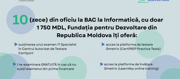 Dacă îți dorești să obții nota “10” din oficiu la proba de examen la informatică din cadrul examenului național de bacalaureat, află că Fundația pentru Dezvoltare din Republica Moldova (FAM) are grijă de viitorii absolvenți și la acest capitol. Acum, în centrul de testare autorizat Certiport al FAM, poți susține examenele cu recunoaștere internațională (IT Specialist) pentru certificarea competențelor specifice domeniului informaticii, stipulate în Ordinul Ministrului Educației și Cercetării nr.1326/2023.